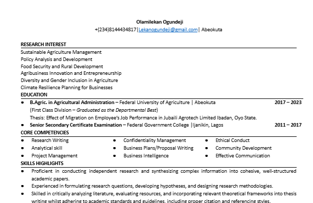 Hello, my name is Olamilekan OGUNDEJI, a first-class university graduate (4.5-5.0). I am a professional research content writer specialising in creating data-driven research content that gives my target audience, a network of institutions, Professors, Doctors, master students, undergraduates, and business organisations, peace of mind. My journey began in academic writing, where I honed my skills in crafting compelling essays, dissertations, and mini-courses for 24 months. Over the past few months, I have transitioned into numbers-based research writing, developing strategies that effectively communicate value to audiences and drive engagement, conversations, and sustainable insights for my clients to give them the best recommendations for real-life scientific problems.